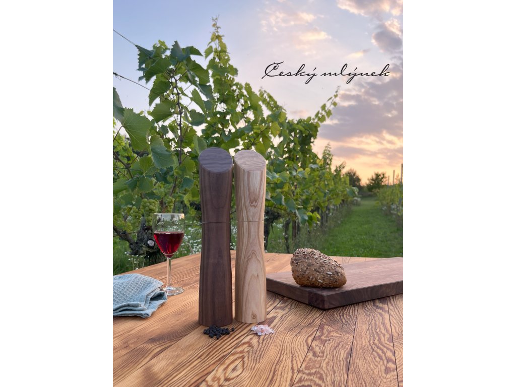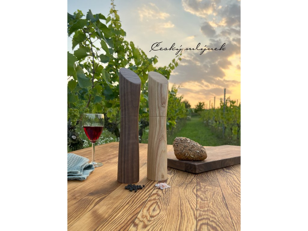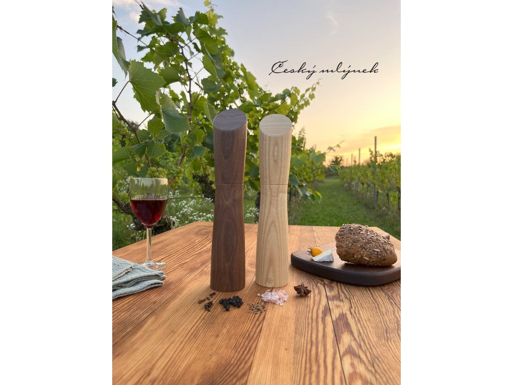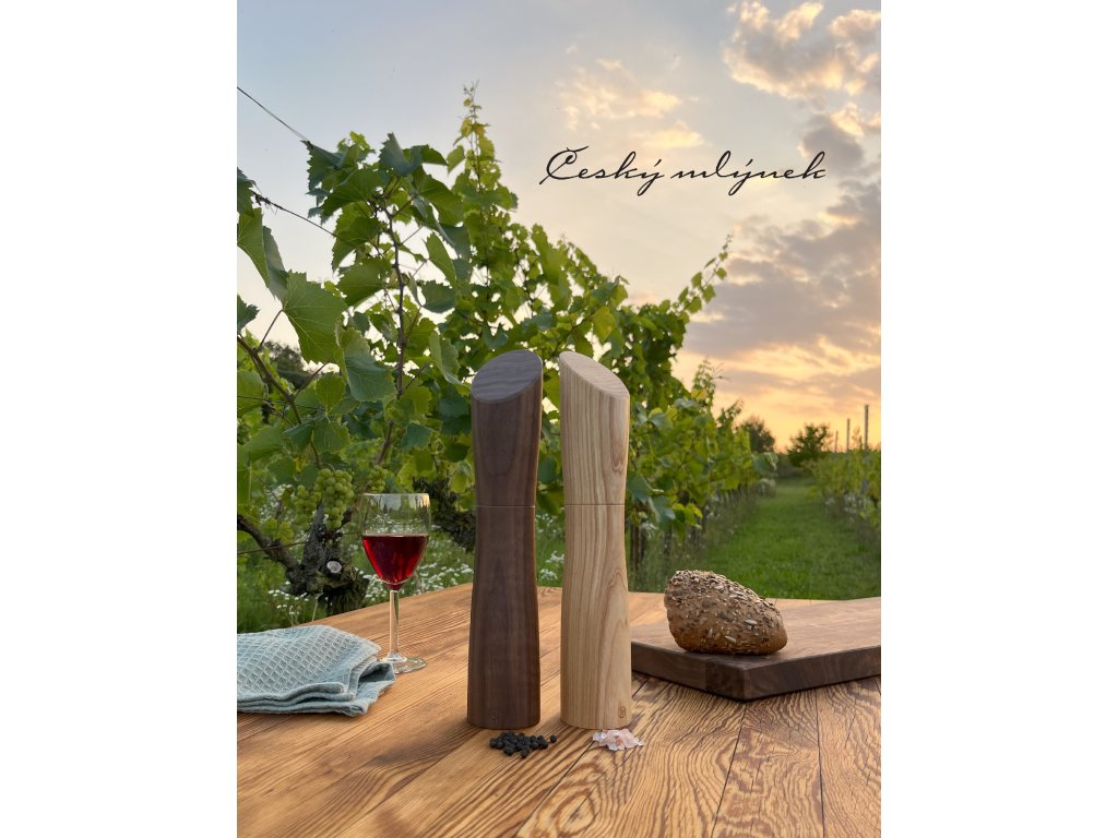Štíhlý tvar s výškou 30 cm krásně padne do ruky a působí decentně i při své výšce. Charakteristickým prvkem je ručně broušená zkosená hlava, která je nejen znakem ruční práce, ale i symbolem designu rodinné dílny Český mlýnek.