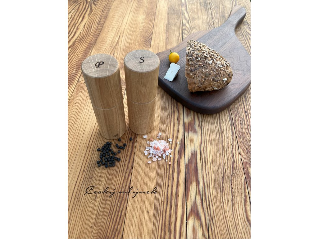 Sada dvou kusů mlýnků na pepř a sůl vyrobená ze dřeva dubu. V horní části jsou mlýnky označeny písmeny P - pepř a S - sůl. Stojánek je možné objednat zvlášť a vždy se budeme v sadě se stojánkem snažit vybrat odstínové stejný.